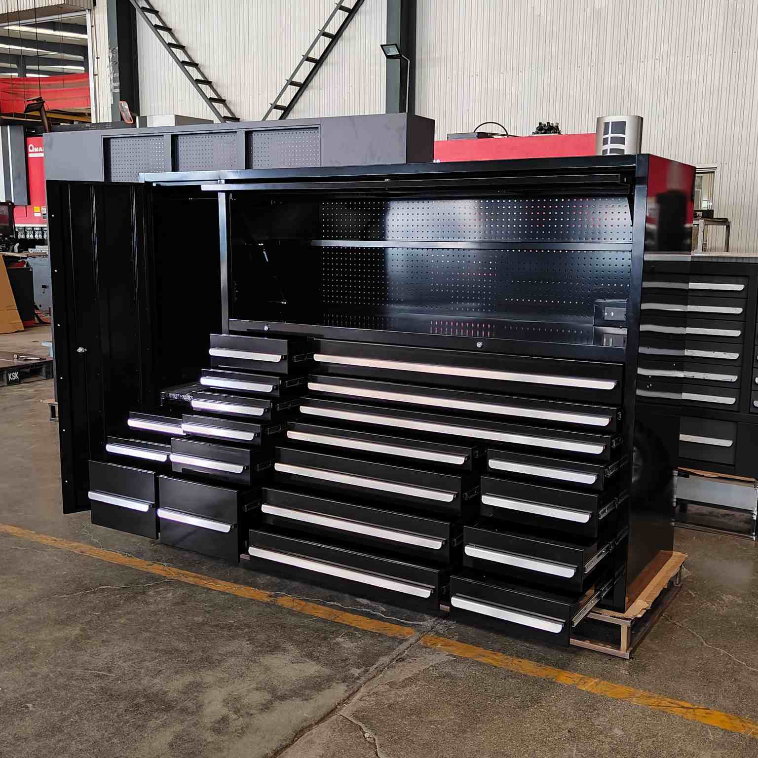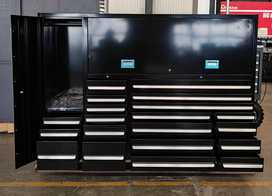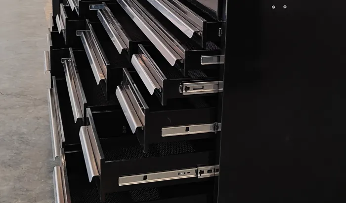 Silent Slide Rails: Kabinet alat pelbagai fungsi hitam mempunyai landasan slaid senyap tugas berat, dengan tindakan menarik yang lancar dan kapasiti galas beban yang kuat.