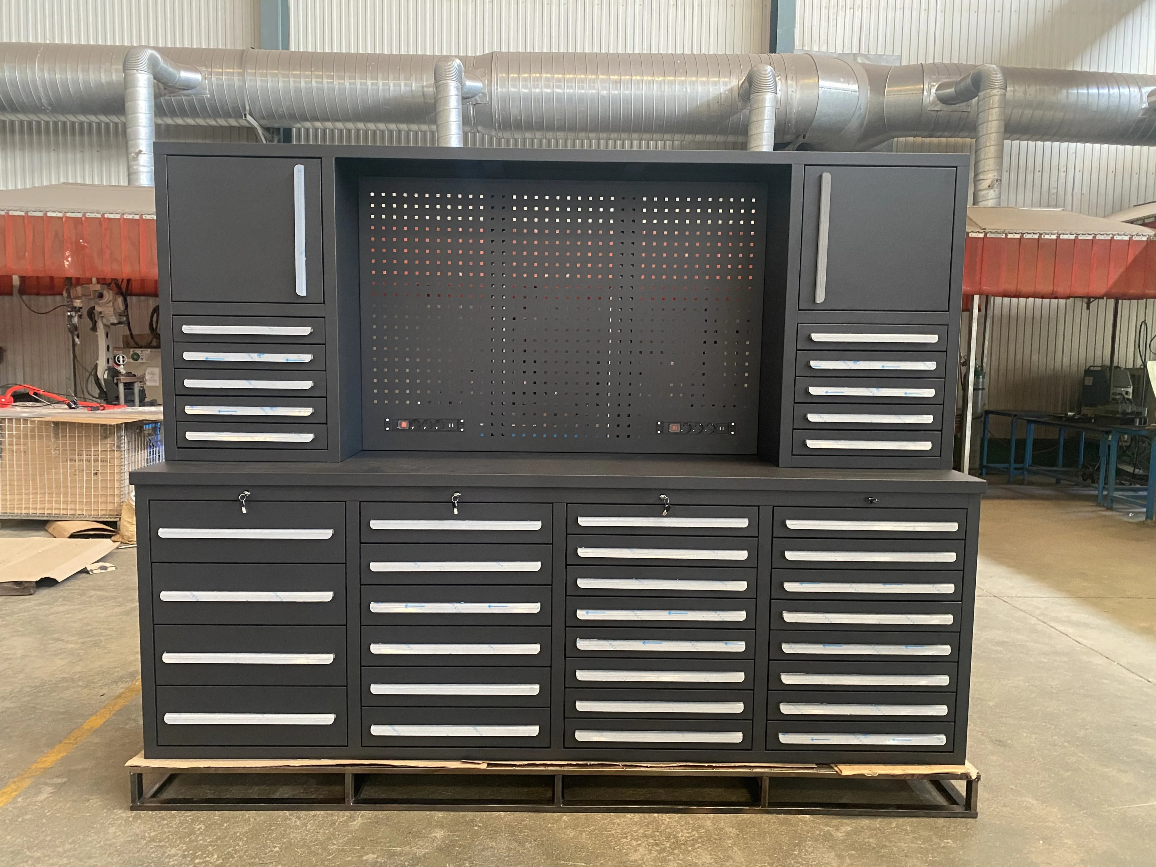 Kabinet alat ini diperbuat daripada plat keluli yang berkualiti tinggi, memastikan ketegasan dan kestabilan. Laci dibuat dari plat keluli tergalvani, menyediakan ciri-ciri anti-karat dan anti-karat yang sangat baik. Di dalamnya, terdapat 36 laci, menawarkan ruang penyimpanan yang mencukupi untuk alat dan bahagian saiz yang berbeza.