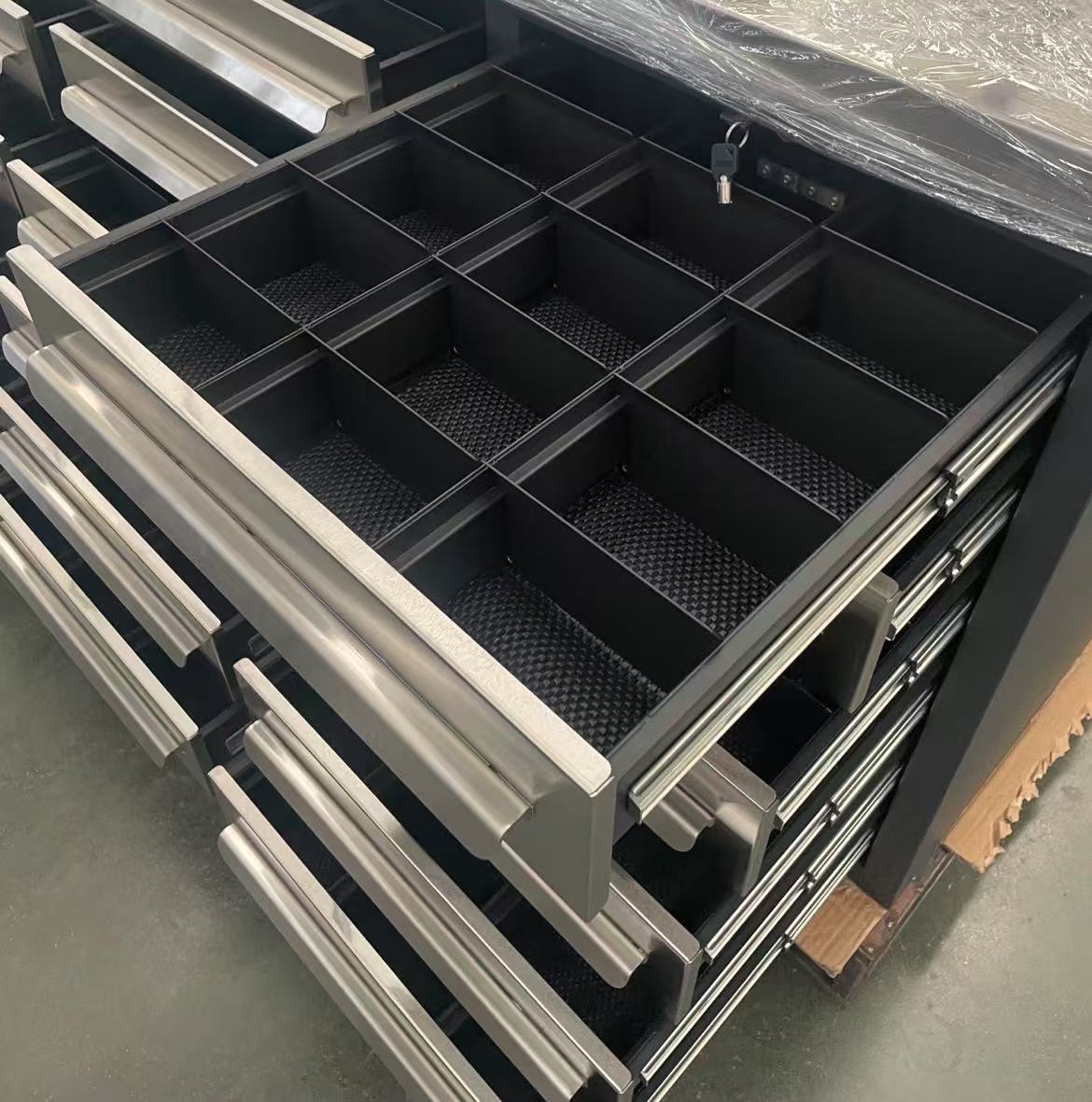 Selain itu, laci dilengkapi dengan pembahagi boleh laras, memperkasakan pengguna untuk menyesuaikan susun atur dalaman mengikut saiz dan jenis alat mereka. Sistem partisi yang boleh disesuaikan ini bukan sahaja memaksimumkan penggunaan ruang tetapi juga menggalakkan organisasi yang lebih baik, membuat pengambilan alat lebih cepat dan lebih intuitif.